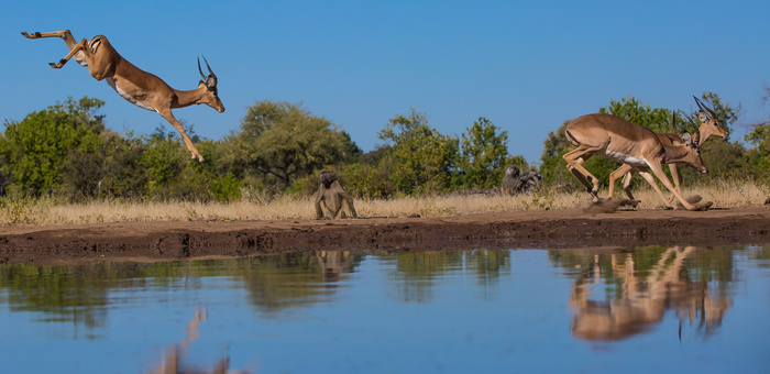 "A Leap of Faith": These impala bucks were frisky one winters morning, entertaining a baboon as they leapt about the water hole in the Mashatu Game Reserve, Botswana.