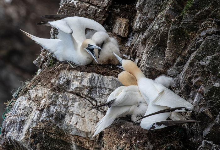On a photo tour with "Shetland Nature" with David Tipling in the Shetland Islands we photographed northern gannets as they nested on the towering cliffs of Hermaness on Unst. The cliffs were home to 45,000 pairs and it looked like a noisy "high-rise city". The cliff ledges were very narrow and as the chicks grew space became precious and many squabbles broke out! This was in the Scottish summer of 2018 (July).
