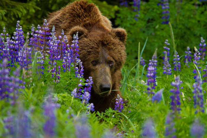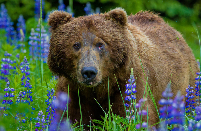 This scarred, adult male brown bear was following his female partner waiting to mate - she was feeding in the lush grass amongst the colourful Lupines! Walking with Bears at Silver Salmon Creek, Lake Clark National Park, Alaska in the summer (July) of 2012.