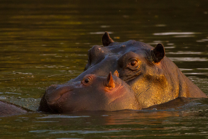 This Hippo cow and calf were photographed in the Zambezi River at Livingstone in Zambia just before sunset - the river was full of golden lights from the setting sun. August, 2012.