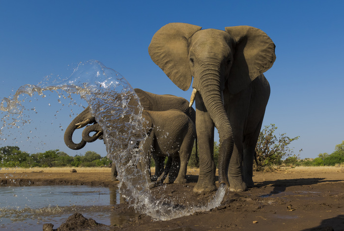 Mashatu Game Reserve in Botswana is renown for its photographic hides. One is placed at a water hole on an elephants daily route. The family groups pass by and stop for a drink. Tiny calves and huge matriarchs stand side by side. A large matriarch had her drink and then started squirting water at the other elephants around the waterhole. She then turned and sprayed her trunk full of water directing at the hide and me!