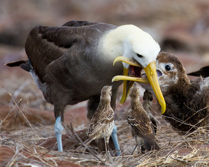 This image is of the magnificent Waved Albatross feeding her chick. The cunning Mocking BIrds were ever ready for a free feed! The photo was taken on Espanola Island, Galapagos Islands, Ecuador, South America in November 2011.