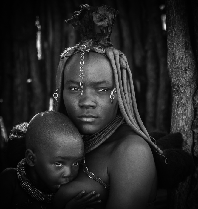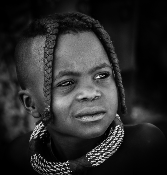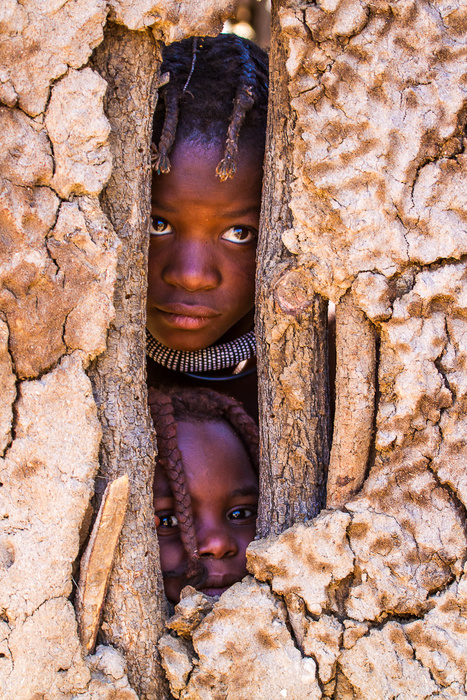 The Himba are mostly a semi-nomadic people living in northern Namibia. The hairstyle indicates age and social status. Children have two plaits of braided hair. These two children were peeping at us from inside one of their huts! This image was taken in April 2013.