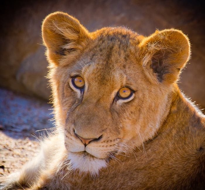 This cub was lying on a large rock with its mother, who was sound asleep in the afternoon sun. The youngster was intent on watching the safari vehicle, which allowed for some lovely close-ups. Buffalo Camp, Kepama Private Game Reserve, South Africa, July 2012.