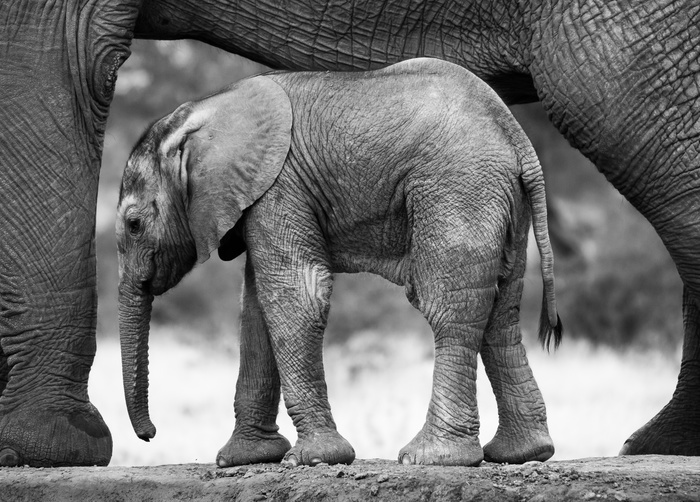 Mashatu Game Reserve in Botswana is renown for its photographic hides. One is placed at a water hole on an elephants daily route. The family groups pass by and stop for a drink. Tiny calves and huge matriarchs stand side by side. June 2016.