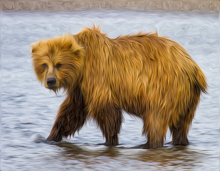 This young sub-adult brown bear clamming along the mudflats at Silver Salmon Creek, Lake Clark National Park, Alaska in the summer (July) of 2012.The image was cropped in Lightroom and processed in Photoshop using Pixel Bender - Oil painting.