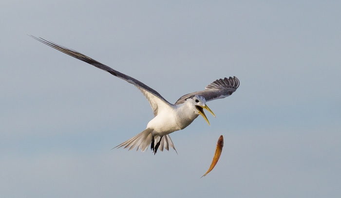 Crested Terns live on a small coastal estuary close to my home in Northern NSW, Australia. The creek is called Cudgera Creek and the area is Hastings Point. These characterful little birds gather on the beach and go through their courtship rituals. This image is of a bird that has caught its fish and either dropped it or was re-positioning the fish in its beak to present to its mate. March 2018.