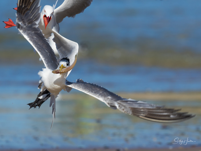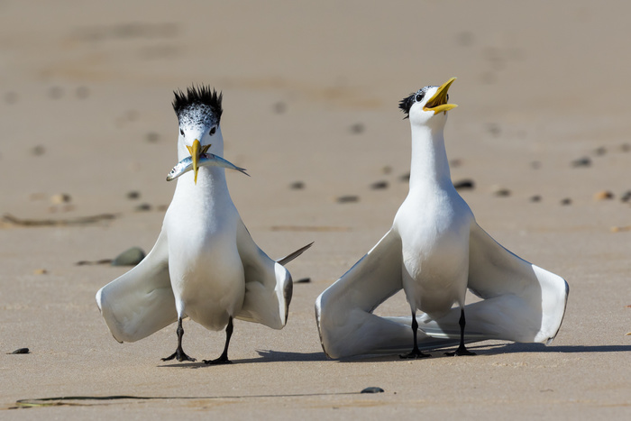 Crested Terns live on a small coastal estuary close to my home in Northern NSW, Australia. The creek is called Cudgera Creek and the area is Hastings Point. These characterful little birds gather on the beach and go through their courtship rituals. This image is of a pair, the female now has the fish which the male caught for her. Once she has accepted the fish they do a slow dance circling around each other lifting one foot up high at a time in slow motion. They are squawking all the time! March 2018.