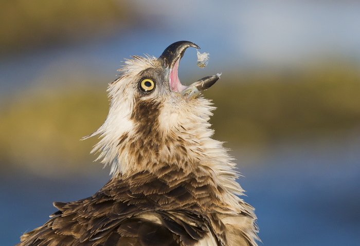 This young Eastern Osprey had caught a large Luderick off Hastings Point Headland in Northern NSW, Australia. As he ate his well earned catch a Brahmany Kite flew overhead and took an interest in the young osprey, who got very upset, fluffed up his feathers and squawked loudly indicating that the fish belonged to him!