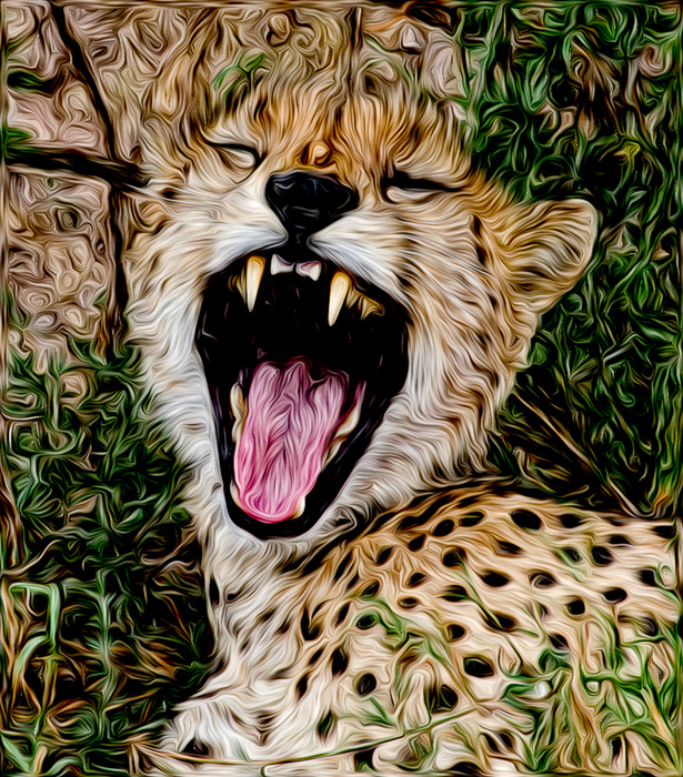 This yawning cheetah was photographed in the Serengeti National Park, Tanzania in September, 2011. The image was cropped in Lightroom and processed in Photoshop using Pixel Bender - Oil Painting.