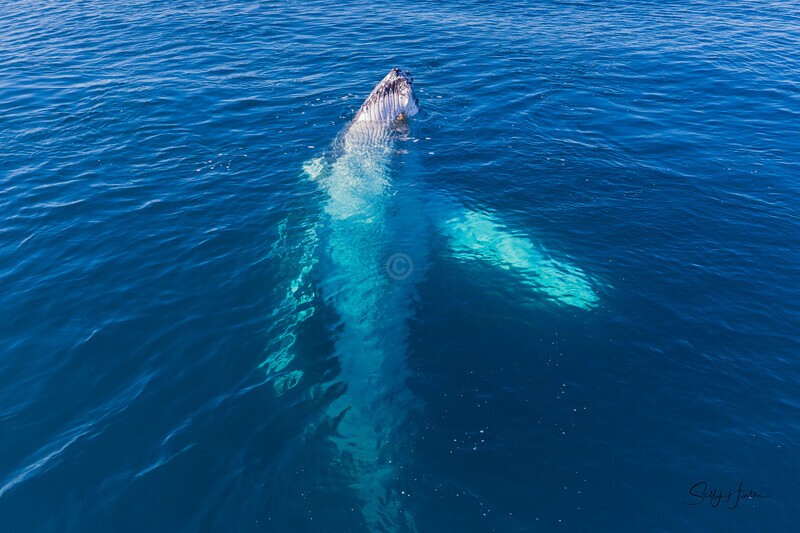 Sub-adult humpbacks are not ready to breed and are very curious around boats - they come over to check out the boat and the people - they spy-hop and appear to hang in the glassy calm water.