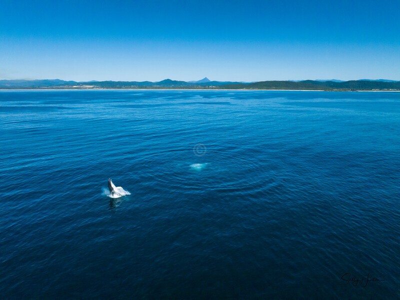 A breaching humpback on a very calm day 3 kms off shore - we Mt Warning on the horizon!